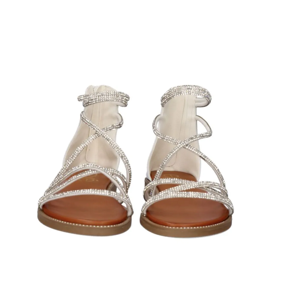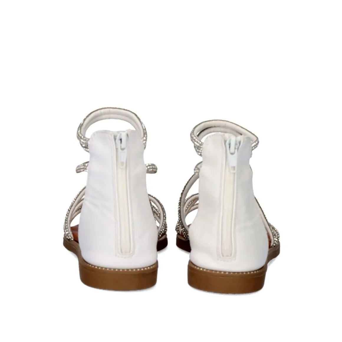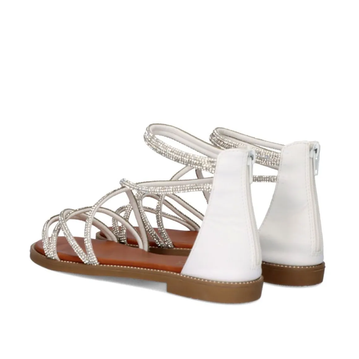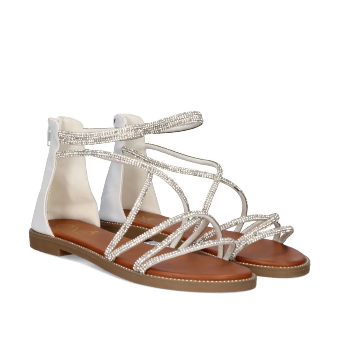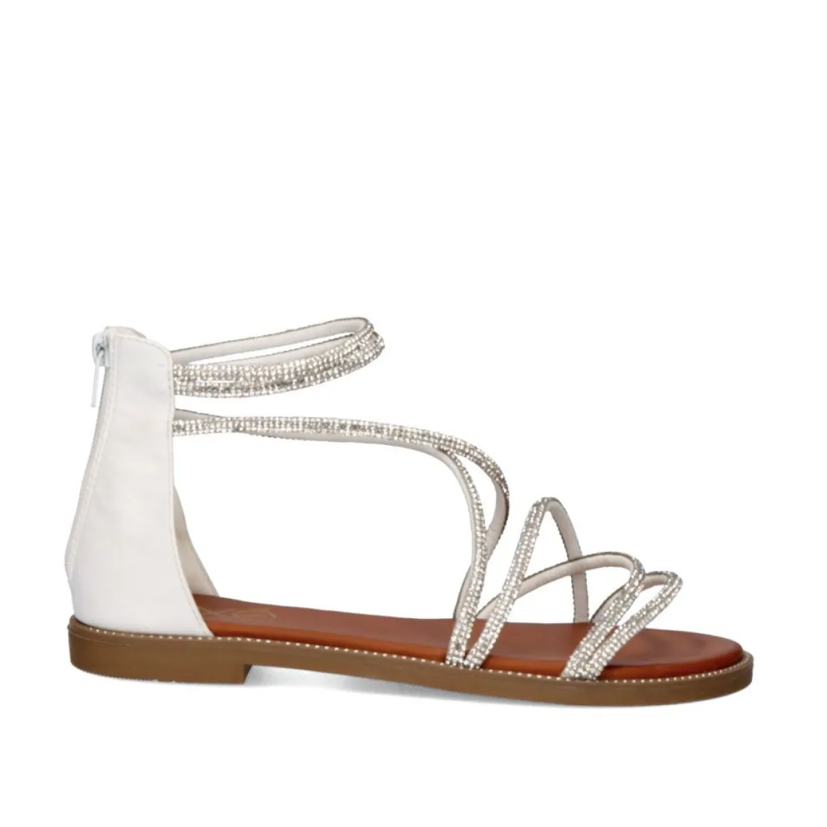 Sandalia Rasteira Sintetica Na Cor Branca Com Detalhes De Cristais Brilhantes Em Todo O Peito Do Pe. Com Fecho De Ziper Na Parte De Tras Para Maior Suporte No Tornozelo.