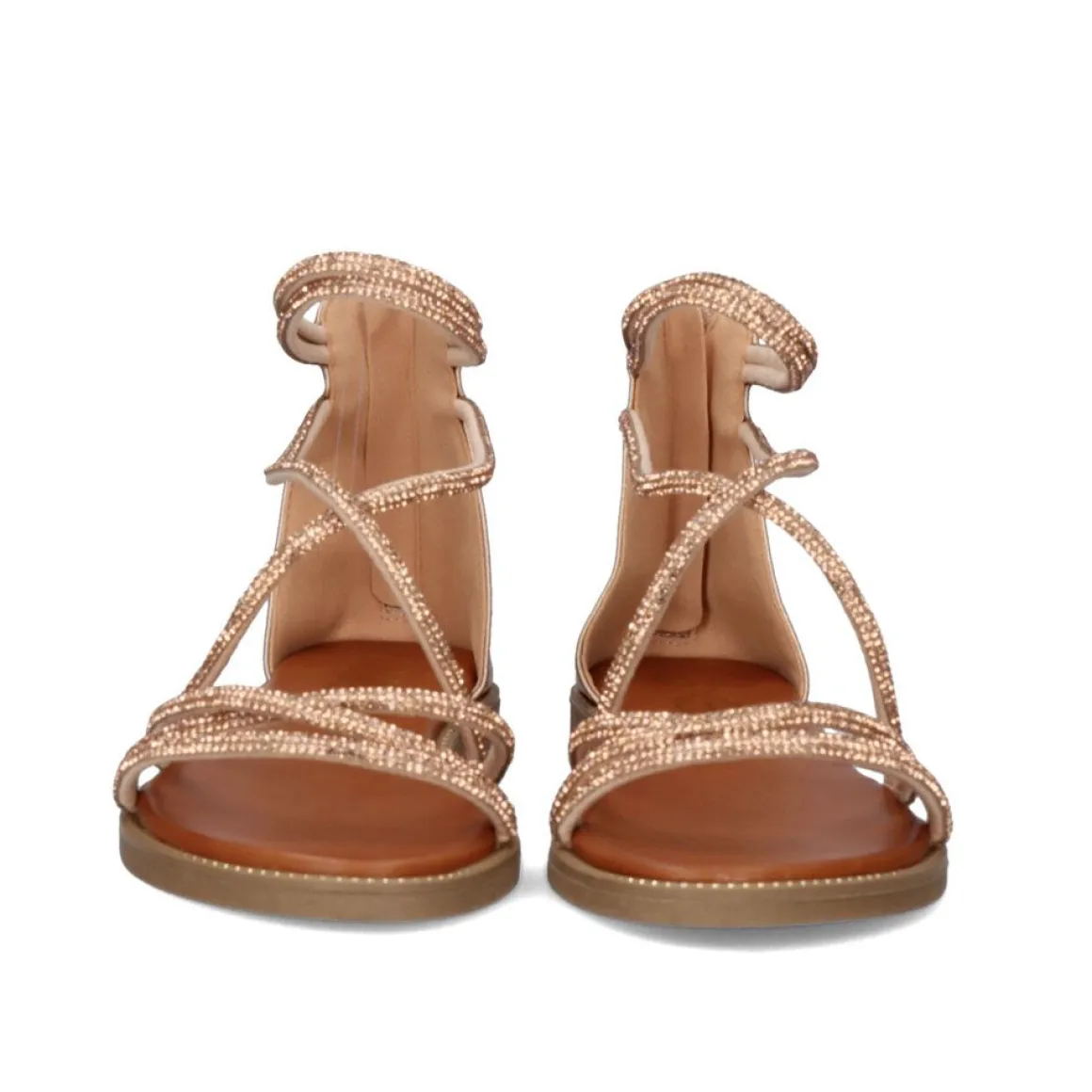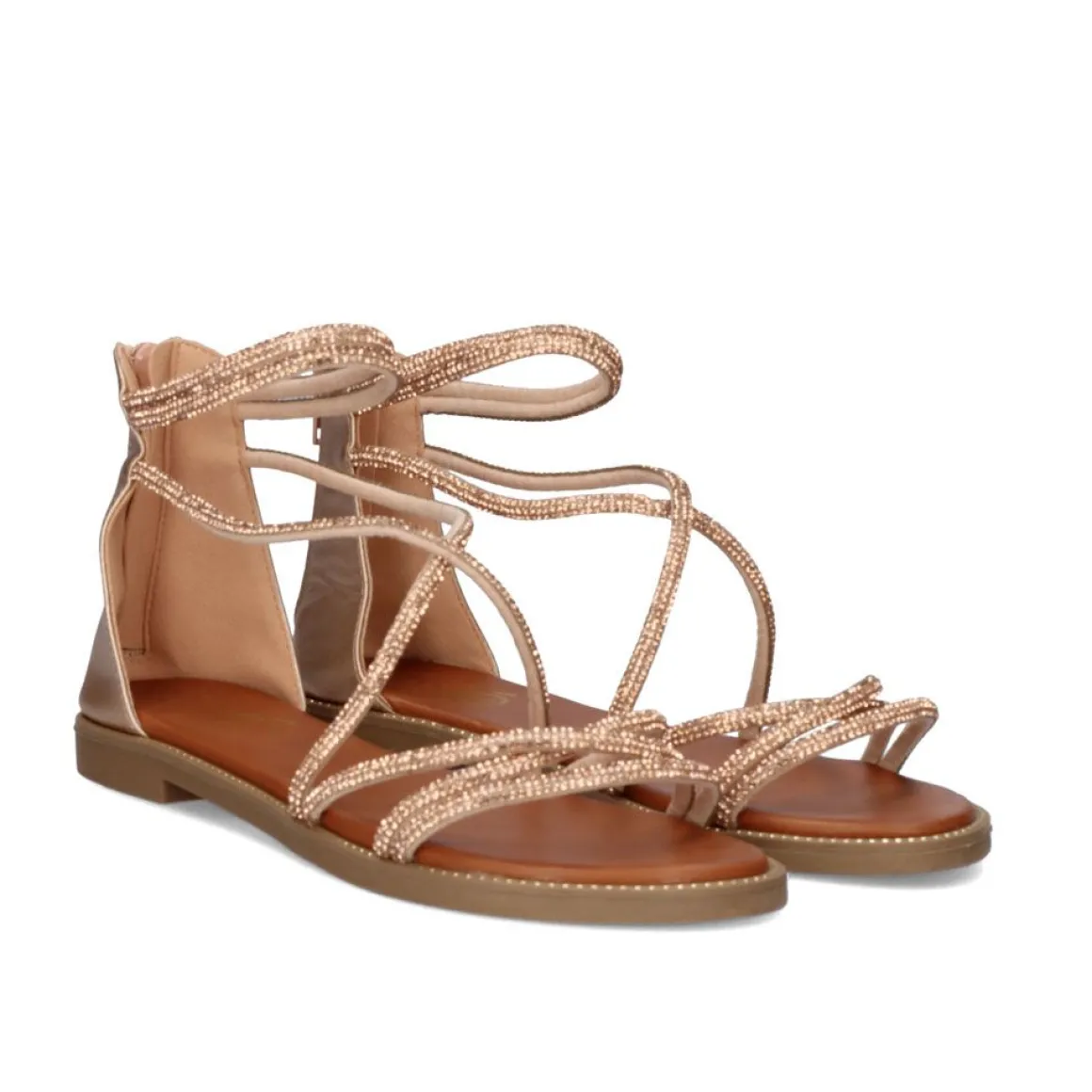 Sandalia Rasteira Sintetica Na Cor Ouro Rosa Com Detalhes De Cristais Brilhantes Em Todo O Peito Do Pe. Com Fecho De Ziper Na Parte De Tras Para Maior Suporte No Tornozelo.