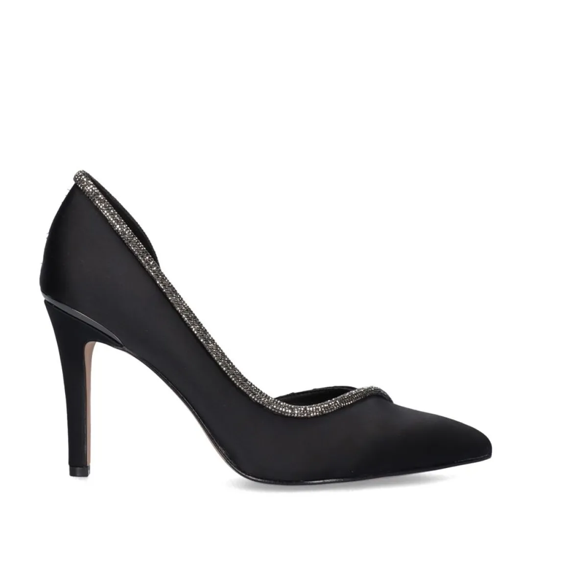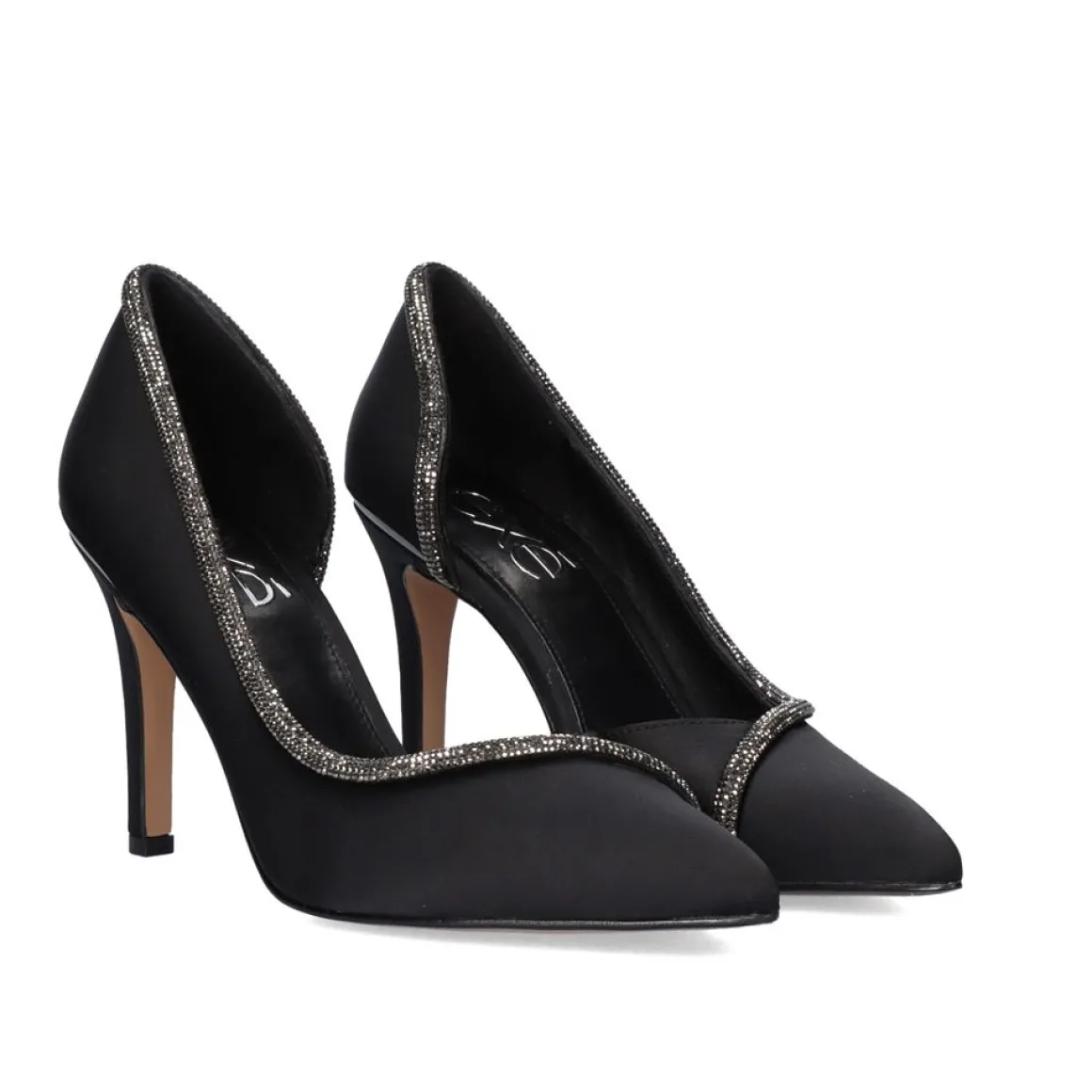 Sapatos De Salao Em Preto. Seu Corte E Sola Sao Feitos De Material Sintetico, A Palmilha E Feita De Couro. Tem Uma Tira De Brilhantes Decorativos Na Cor Estanho E O Seu Calcanhar Mede 9 Cm.