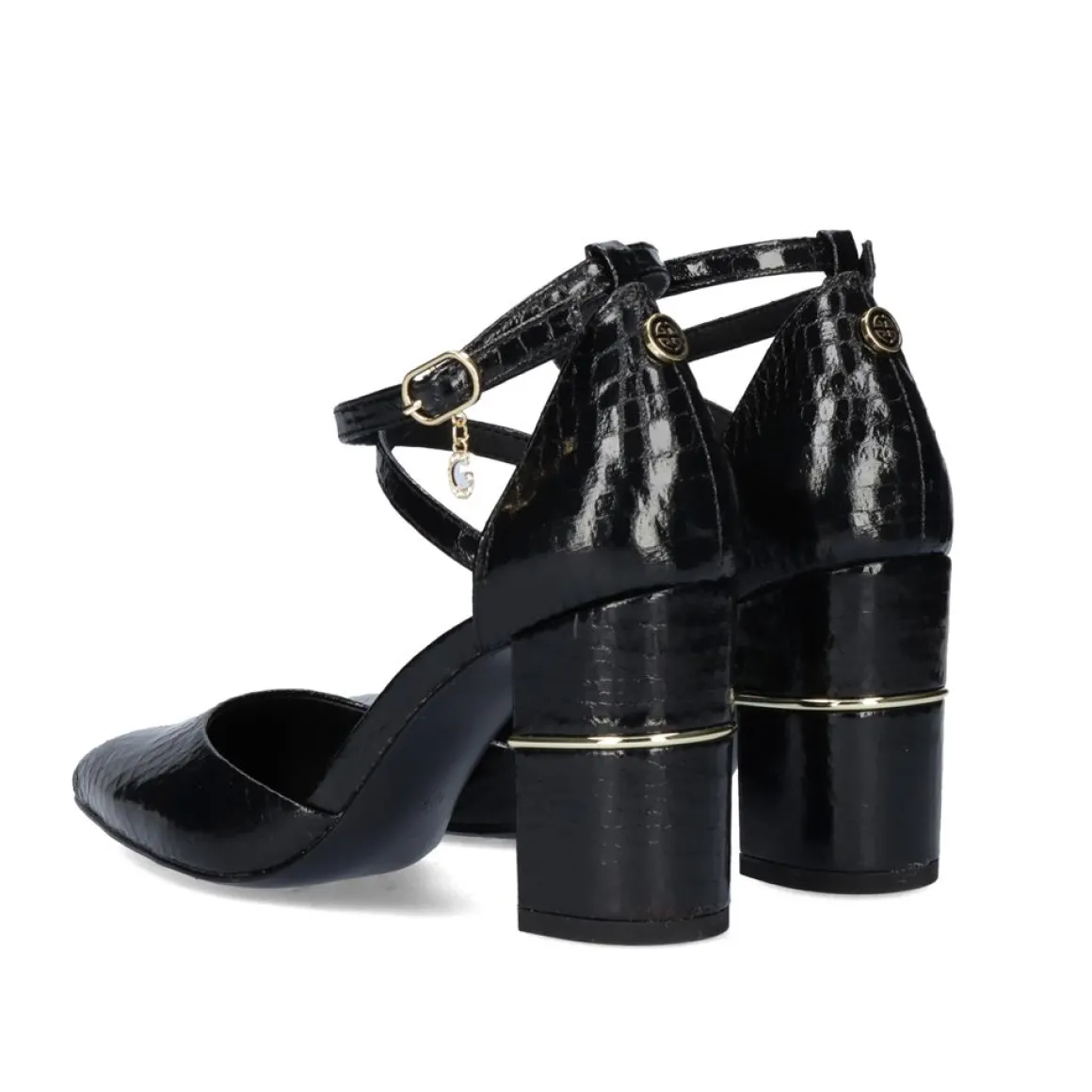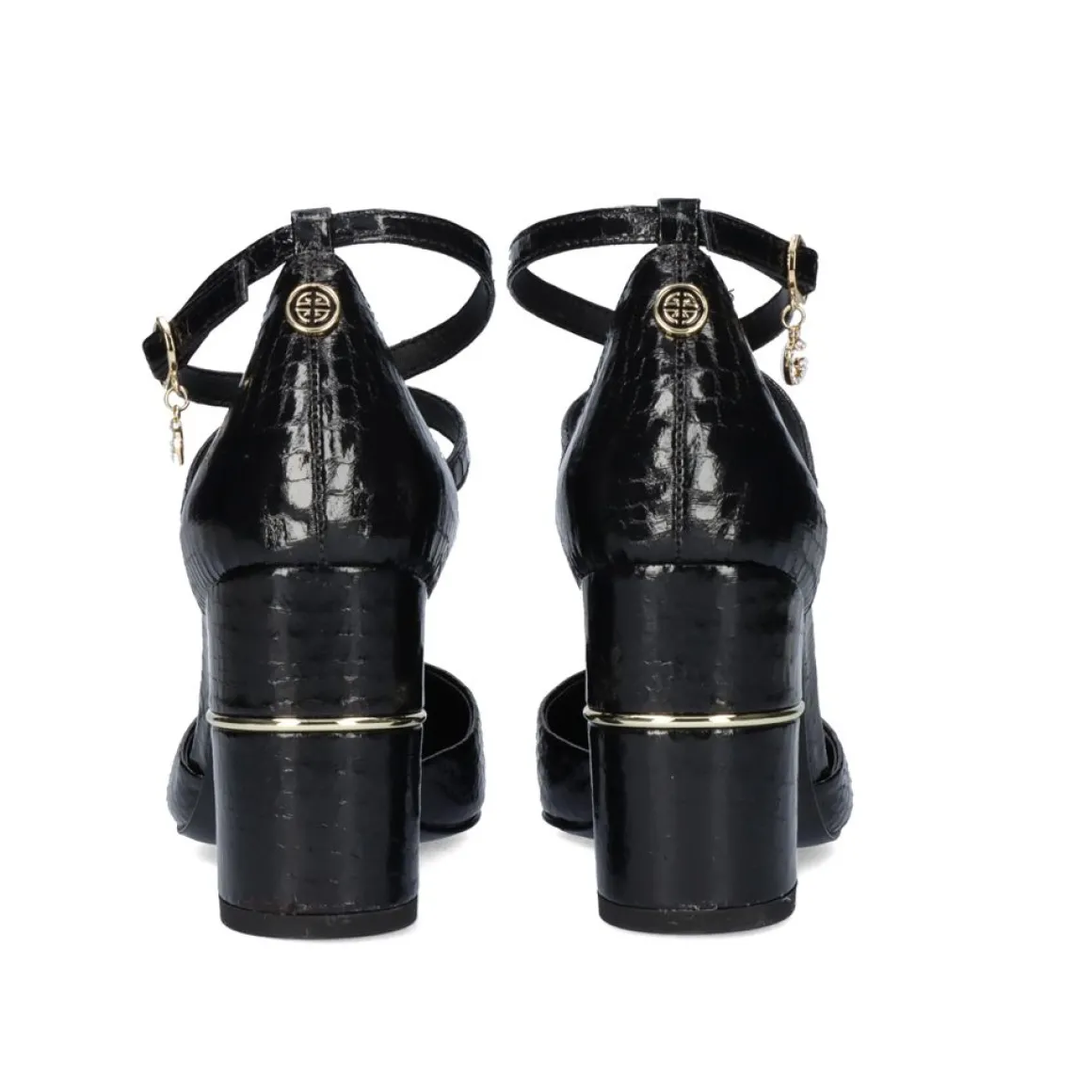 Sapato De Salto (>8 Cm) Na Cor Preta E Acabamento Cobra. Seu Corte E Sola Sao Feitos De Material Sintetico, A Palmilha E Feita De Couro. Tem Um Fecho De Fivela E A Altura Do Calcanhar E De 8,5 Cm.