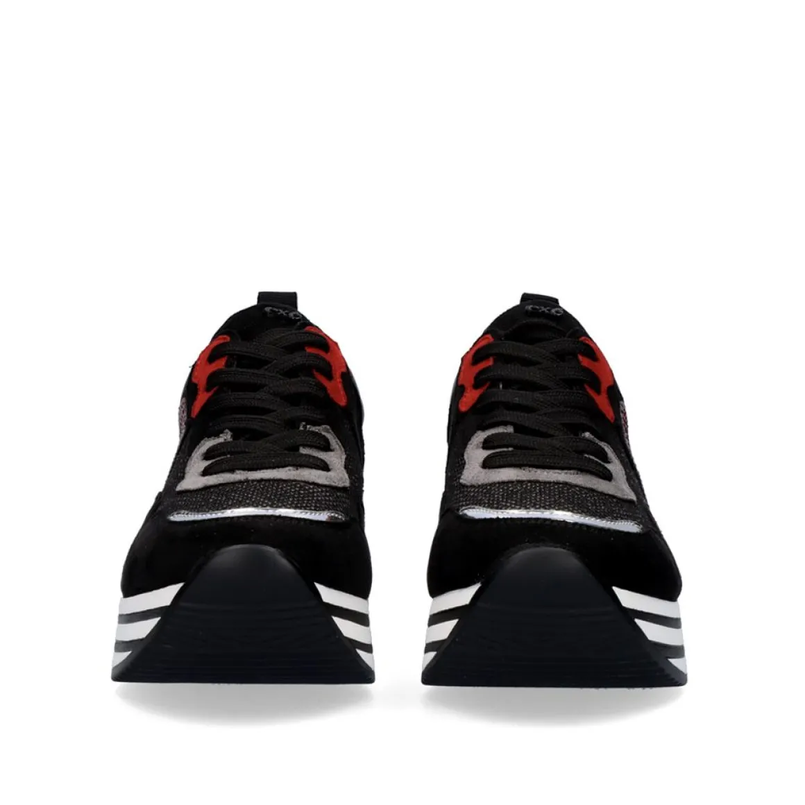 Tenis Em Plataforma Preta E Vermelha Com Calcanhar De 5 Cm E Dedo Do Pe De 3 Cm. Sao Feitos De Materiais Sinteticos Na Sola E Texteis Na Palmilha. Tem Um Fecho De Amarrar