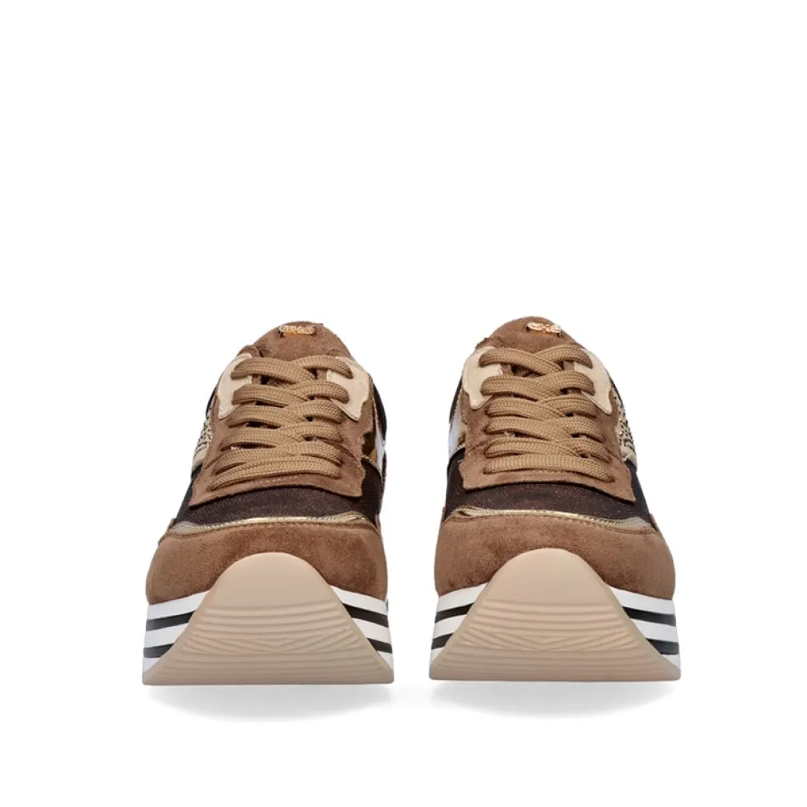 Bronze Plataforma Sneakers E Cordoes De Fechamento. A Plataforma Tem Uma Altura De 5 Cm De Salto E 3 Cm No Salto De Ponta. O Corte E Glitter, A Prata E Feita De Texteis E A Sola E Composta De Materiais Sinteticos.