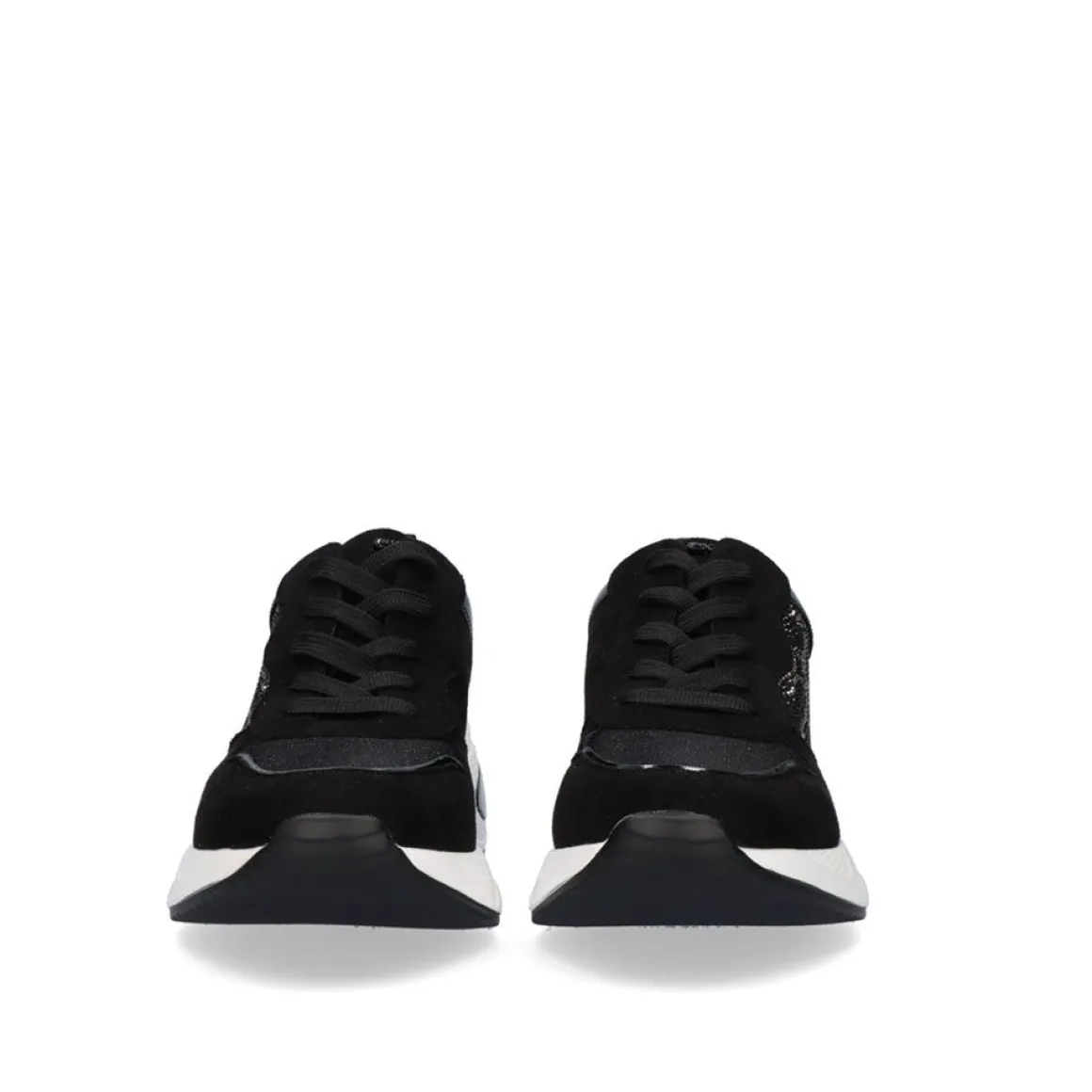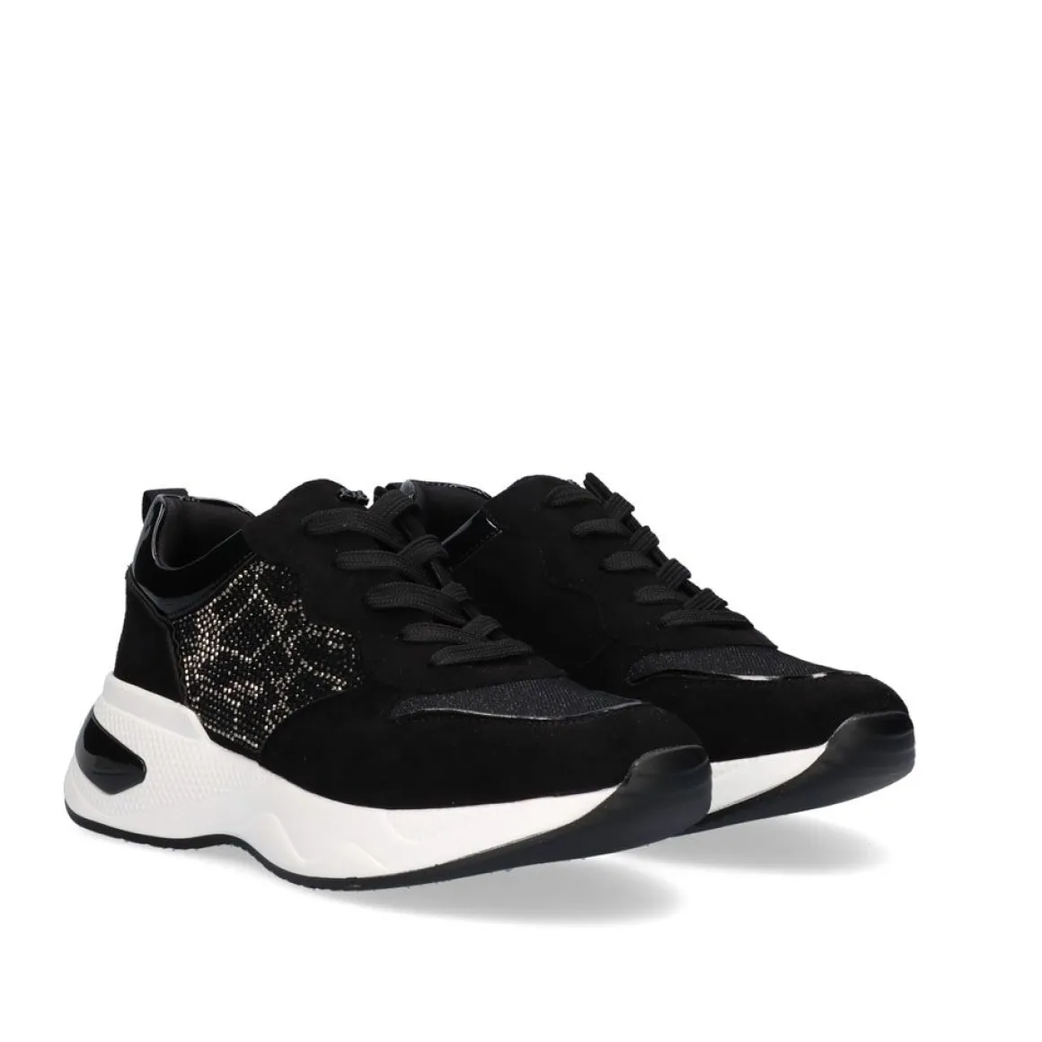 Tenis Em Preto. Seu Corte E Sola Sao Feitos De Material Sintetico, A Palmilha E Feita De Material Textil. Tem Brilhante Como Ornamento E Fecho De Atacadores, A Sua Sola Mede 6 Cm.