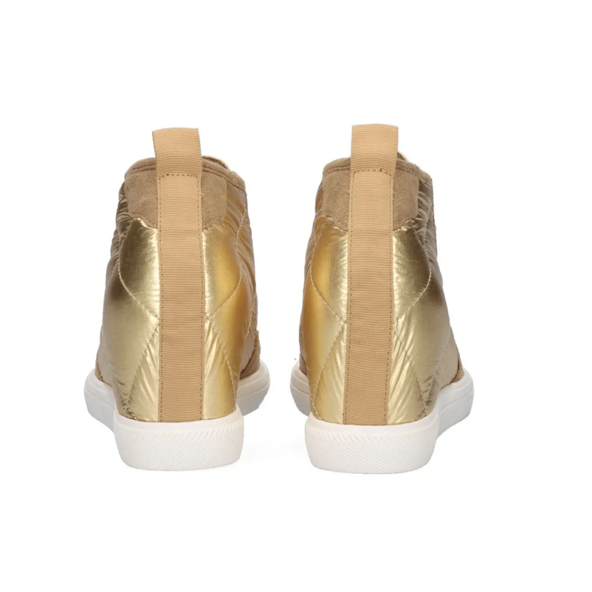 Tenis Em Ouro Metalico Com Cunha Interna De 7 Cm. Seu Corte E Sola Sao Feitos De Material Sintetico, A Palmilha E Feita De Couro. Alem Disso, Tem Um Fecho De Ziper.