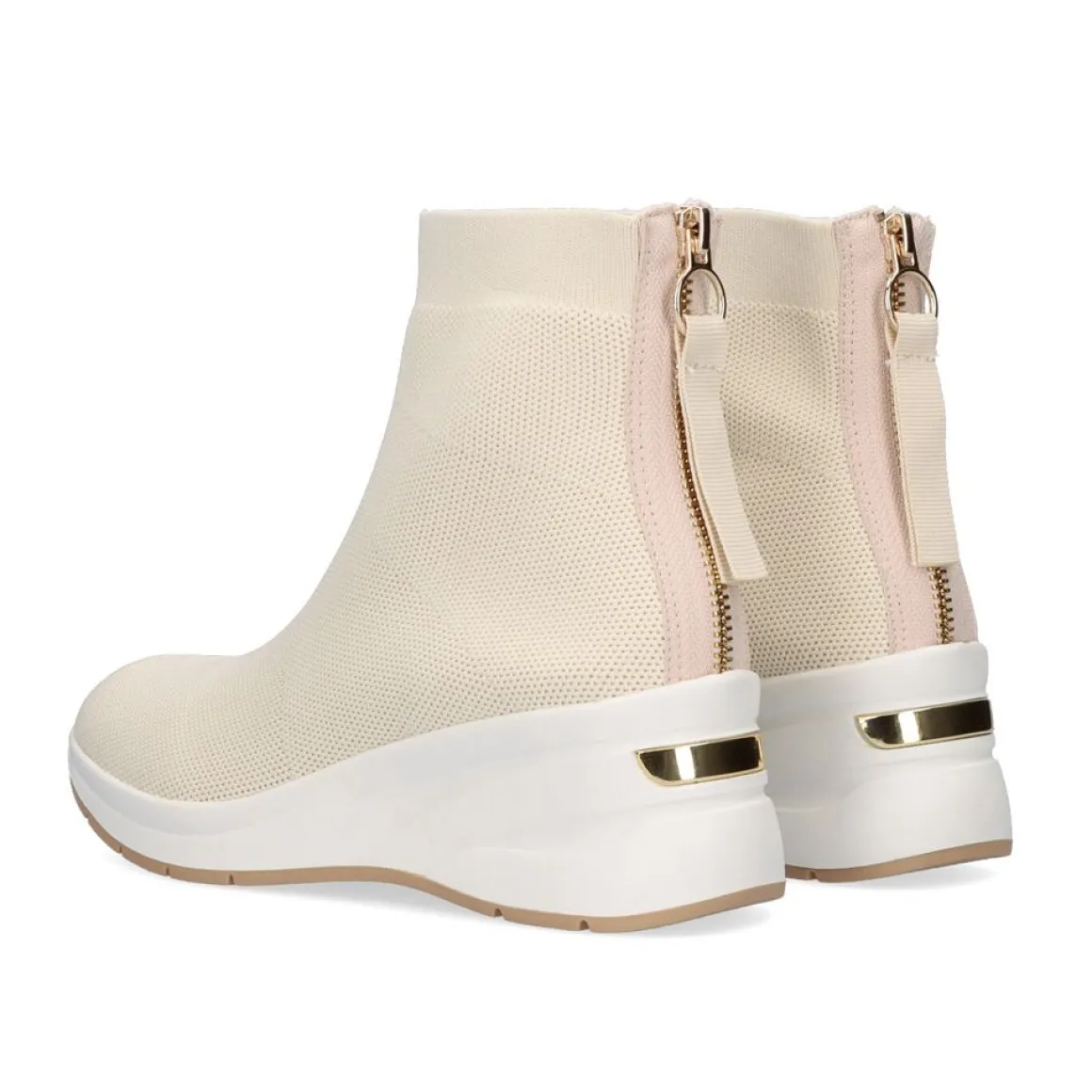Tenis Estilo Meia Em Bege. Seu Corte De Palmilha E Feito De Marial Textil E Sua Sola E Feita De Material Sintetico. Tem Uma Cunha De 6,5 Cm E O Fechamento Tem Um Ziper Na Parte De Tras.