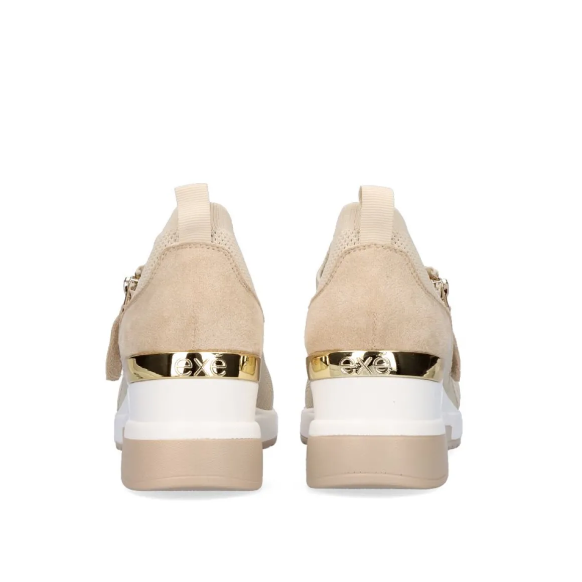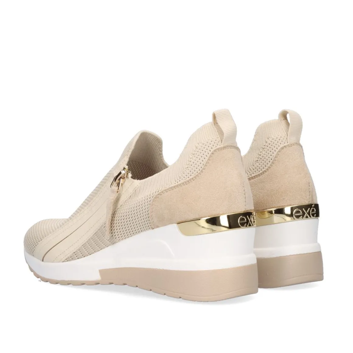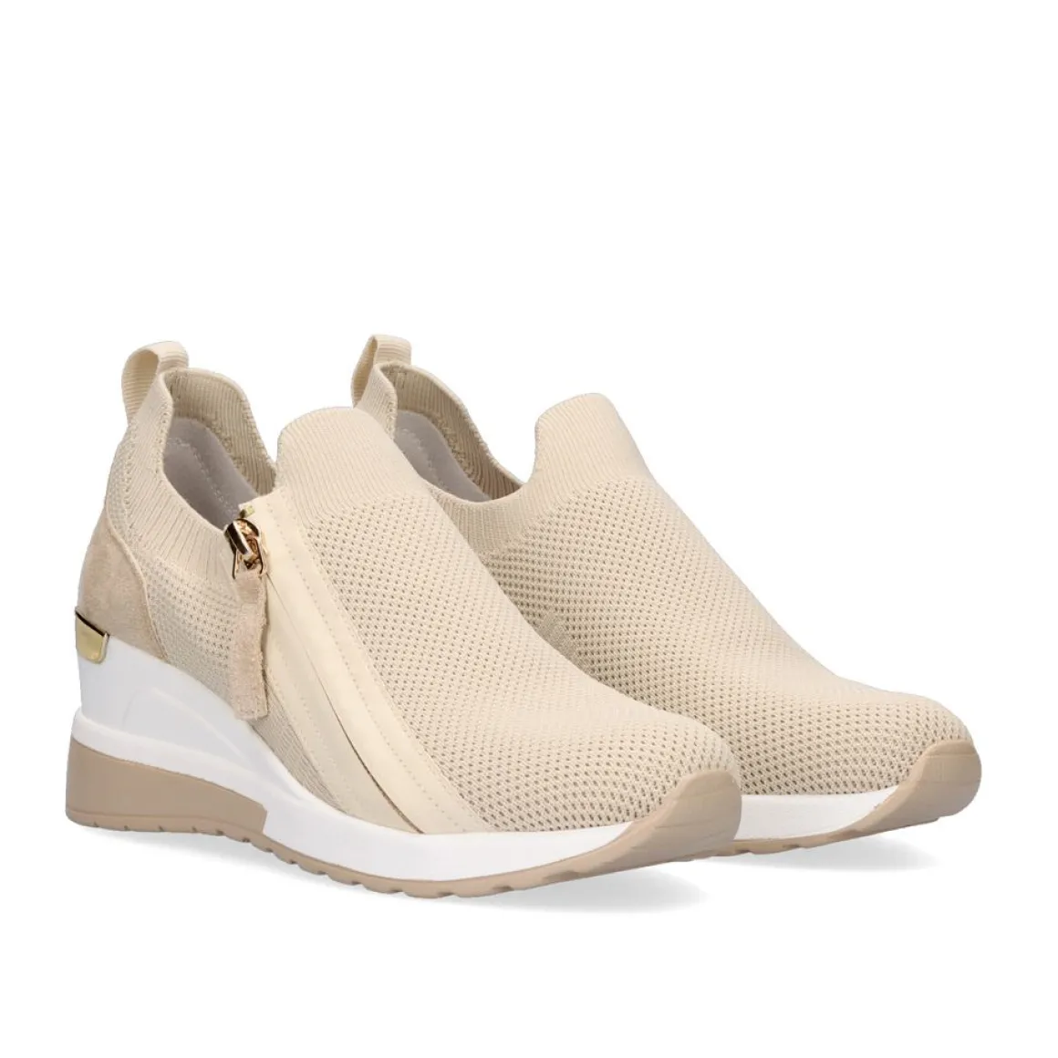 Tenis Bege Com Ziper Lateral. Seu Corte E Palmilha Sao Feitos De Material Textil, Sua Sola Em Forma De Cunha E Sintetica E Mede 7Cm.