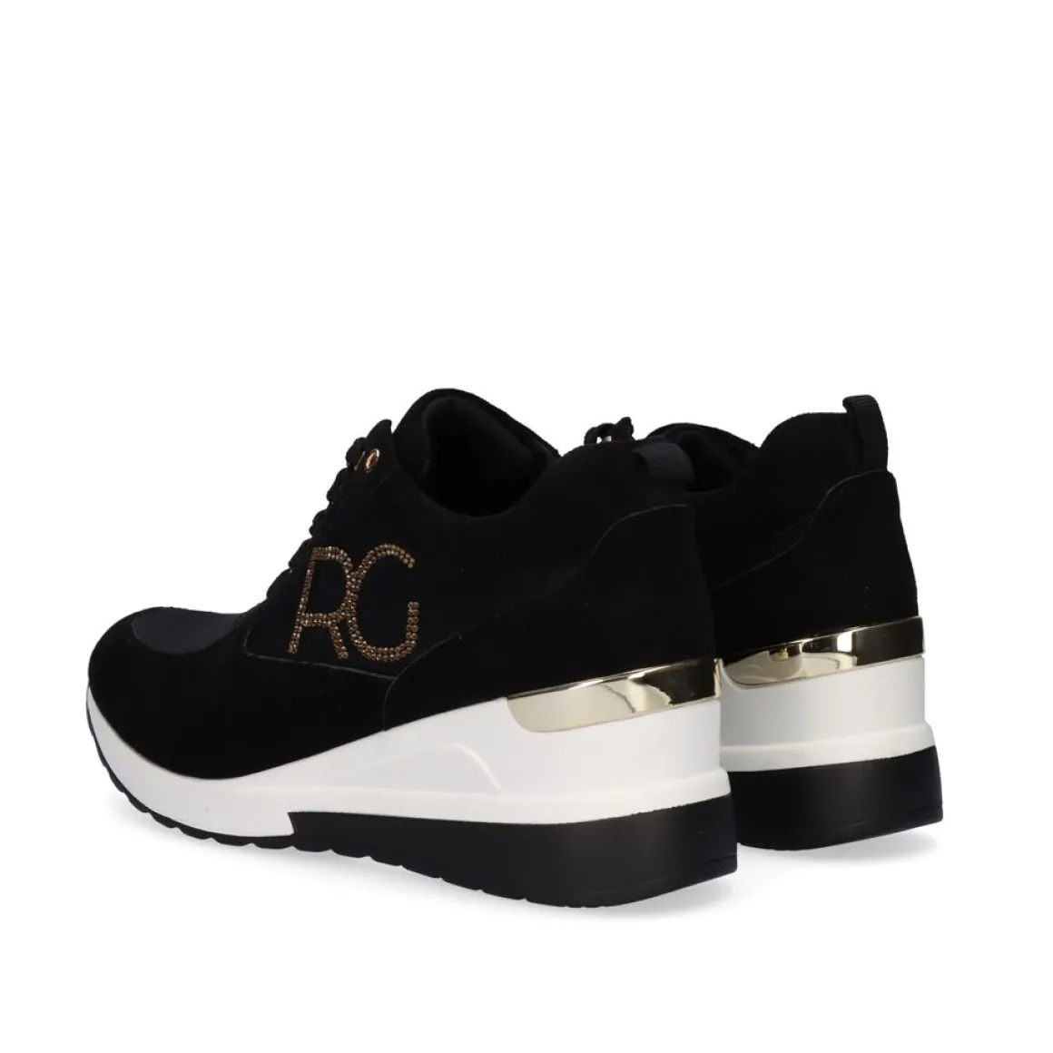 Tenis Estilo Esportivo Com Cunha Preta E Detalhe Lateral Com Letras Rg Em Ouro. Desportivo Com Cunha Interior De 7 Cm, Palmilha E Cano Em Tecido Com Sola Sintetica.