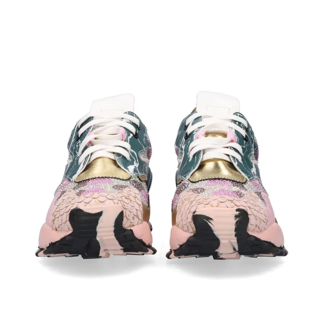 Tenis Na Cor Rosa Com Brilhos Decorativos. Seu Corte E Palmilha Sao Feitos De Couro, A Sola E Feita De Material Sintetico. Tem Fecho Em Renda, Detalhes Em Acabamento Serpente E Uma Sola De 4 Cm.